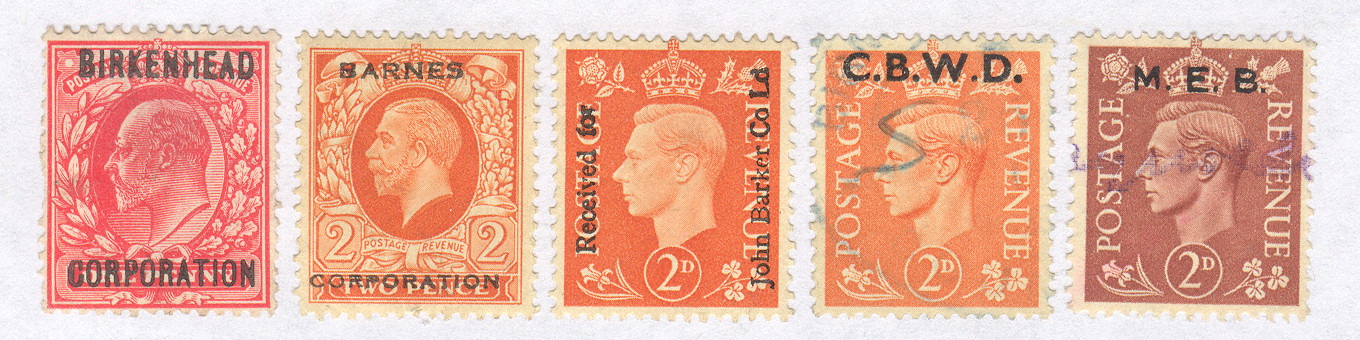 ![]() | These are known as 'Commercial Overprints'. The stamp is usually overprinted with the name of a local authority or utility company to prevent petty-theft much in the same way as perfins. The difference is that these were used for receipt purposes at a time when duty was payable hence some have 'Received for' as part of the design. When this duty was abolished in 1971, the unused stocks could be used postally for a period of 6 months. |