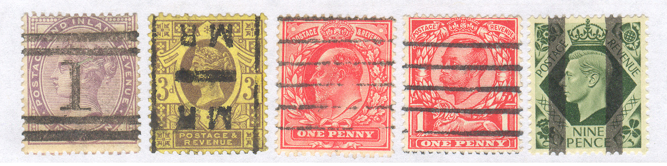 The Victorian 1d one shows a Scottish cancellation, in this case Aberdeen (they were numbered alphabetically). The next is a parcel cancellation which can come in many varieties often with rectangular designs, the next two are machine cancellations and the last is a type used by the Post Office for training purposes which is often seen on King George VI and Queen Elizabeth stamps with 1 or 2 bars. Apart from the last, these postmarks are more often at an angle, but when neatly parallel with top or sides can look like a precancel. |
