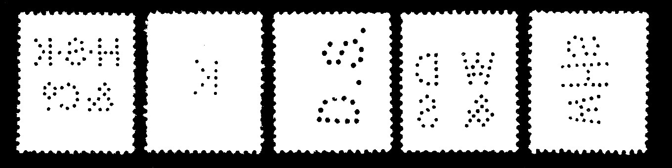 ![]() | Seen from the back, these perforated initials or designs are known as 'Perfins'. They are not used to cancel the stamps (at least not in Britain) and are for the purpose of identifying the owner of the stamp to discourage petty theft by employees. Although not precancels themselves, they are often found on precancelled stamps. |